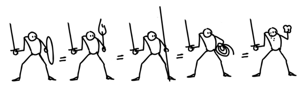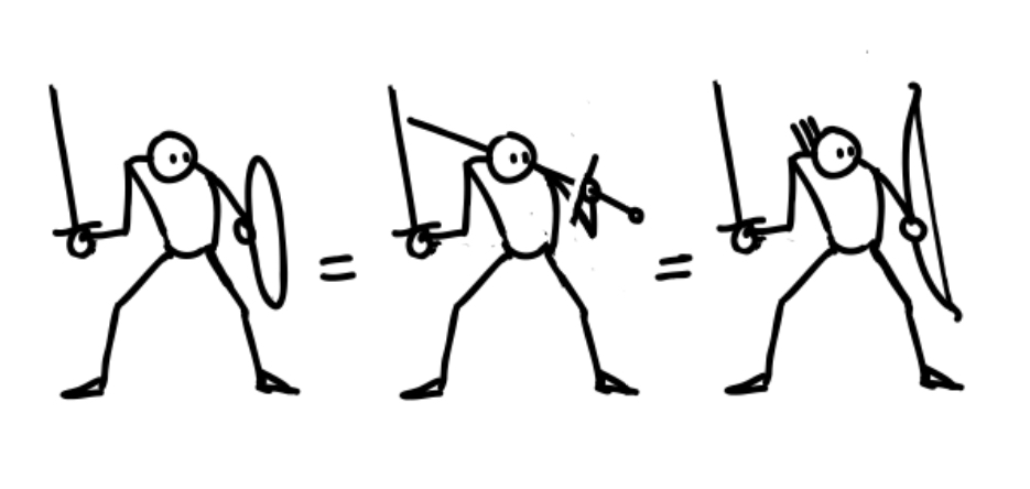 I buried the lead, but this is really what I’m driving at. If you can hold a shield, you can hold a sword. And if you can hold a second sword, it can be a 2H sword. And if you can hold a 2H weapon – just hold, not wield, mind you – then you can hold any 2H weapon, including things like bows.