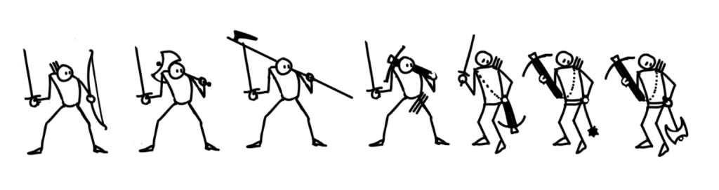 In BX and OSE, there are no hard written rules for changing from one weapon to another. The closest thing we have to a source of truth is the notably messy Example of Combat on B26, which exemplifies more rulings than rules; the cleric “readies her mace and braces her shield” for a whole wasted round, while the Elf fires an arrow ahead of the group’s lost initiative and draws her sword without missing an attack.