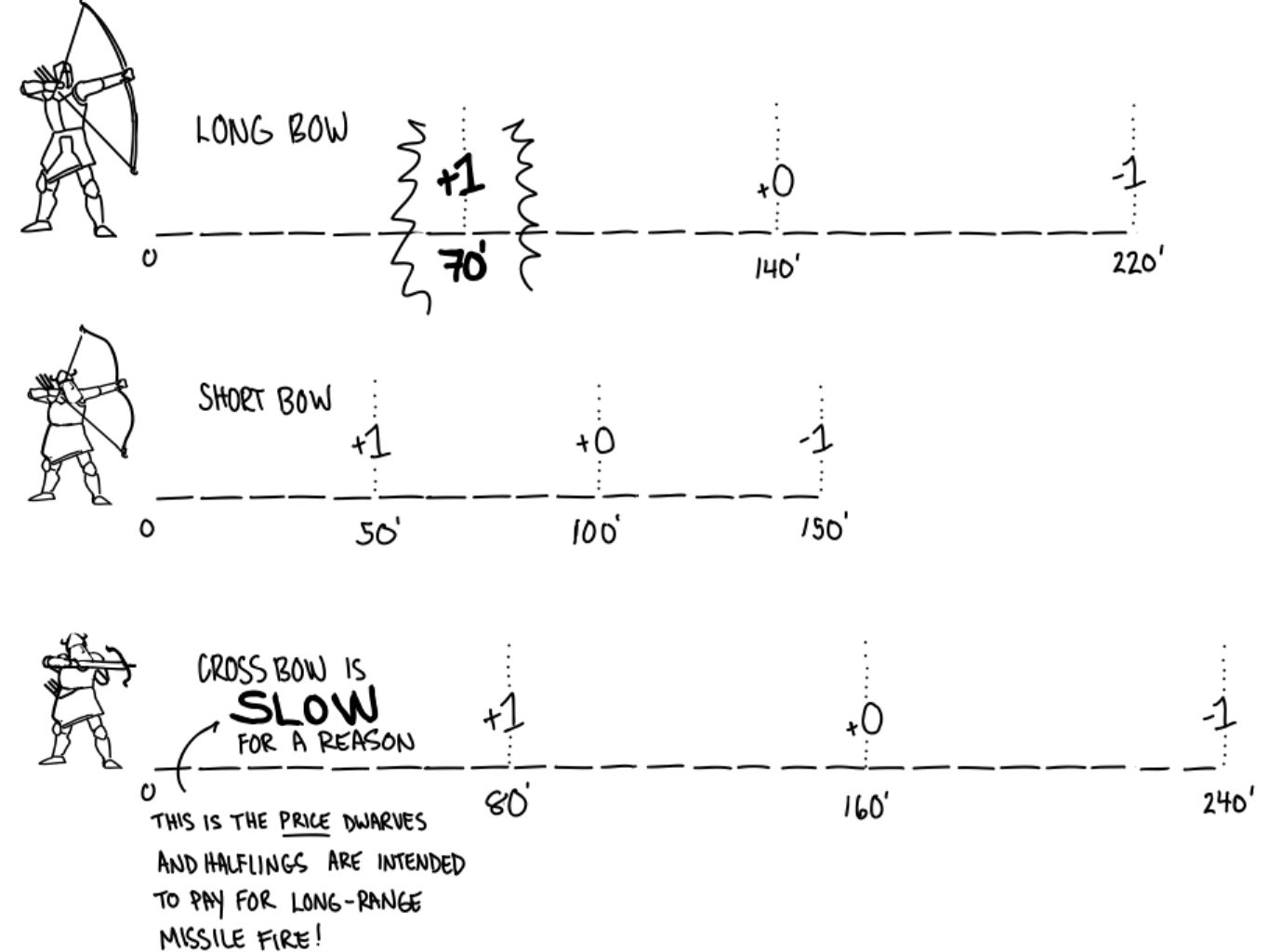 Compared to the Dwarf and Halfling, only the Fighter can hit past 200′ with +1 out to 70′ on initiative. Monsters that charge at 120/40′ will face FIVE d6 missile attacks and the Fighter can still set a d10 pike for 2x damage before it arrives. If the short PCs want to hit that far out, they go last, or every other round. That’s the price of the demihuman.