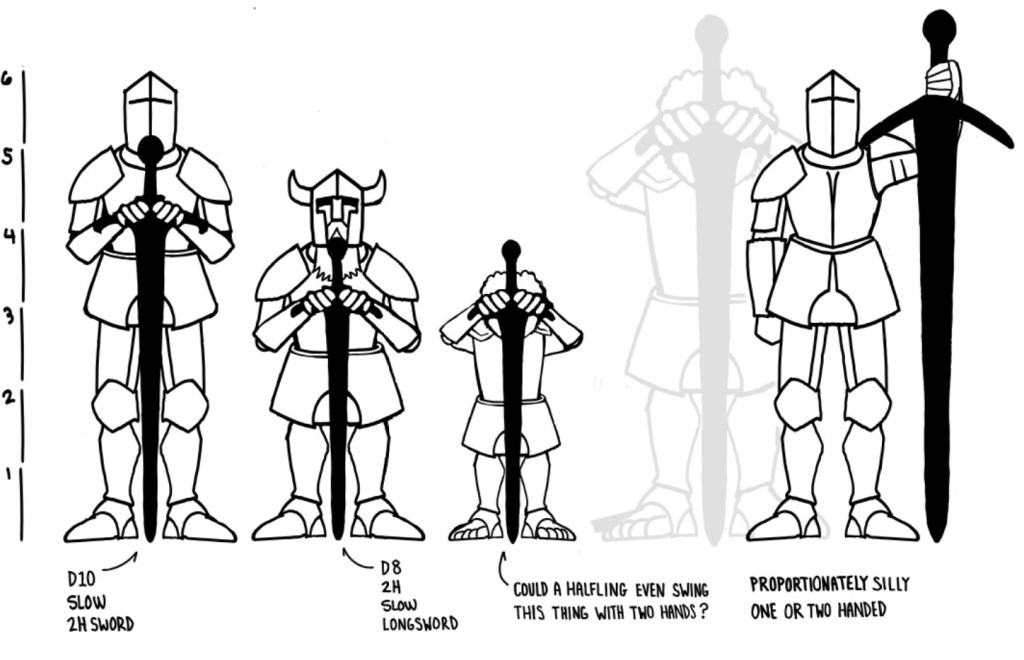 Next, let’s consider the proportions of this sword in the hands of short PCs.